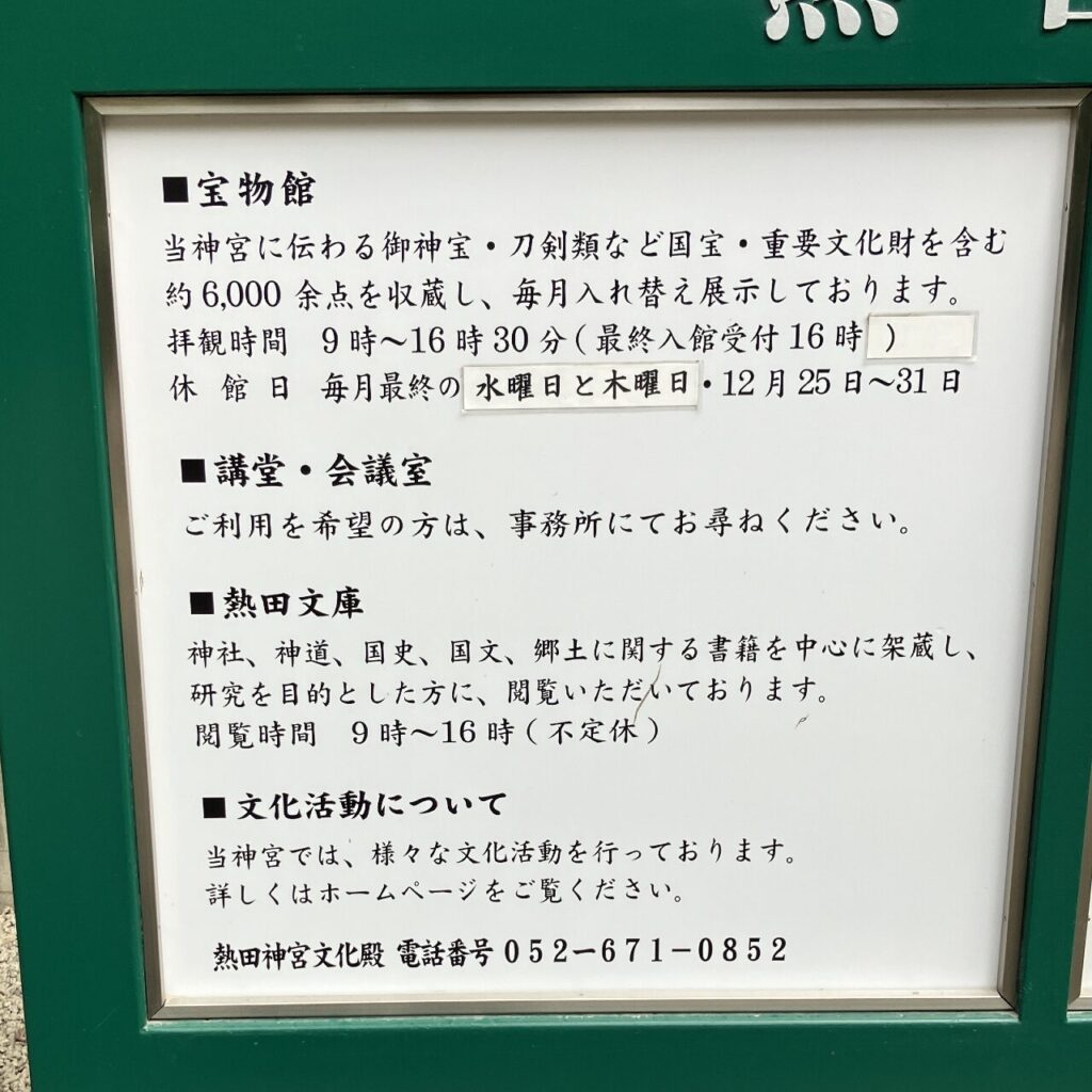 熱田神宮の展示施設は、一般的な美術館や博物館と同じように、展示替えやメンテナンスのための休館日が設定されているんです。特に私が行ったのは年末。一年の中でも特に長いメンテナンス期間に、ピンポイントで重なってしまっていました……。
