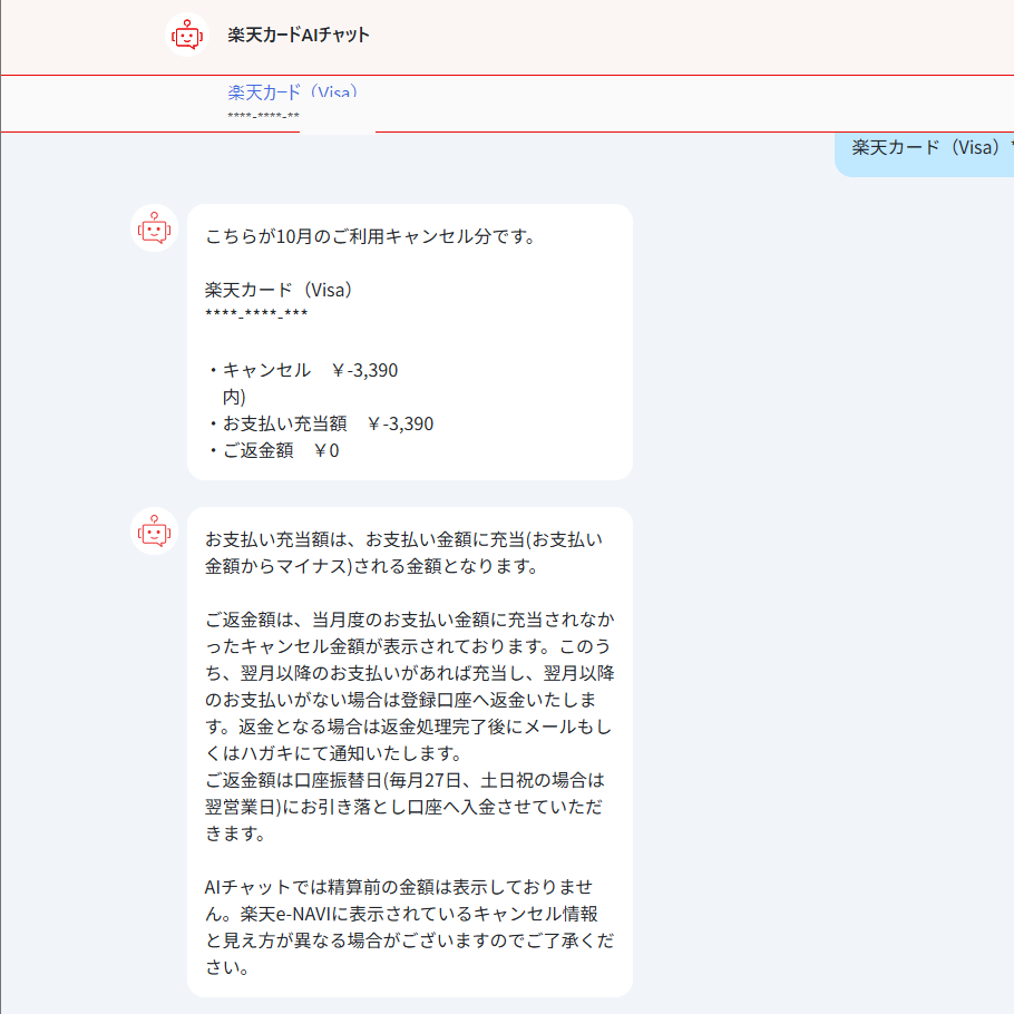 AIチャットで得た情報と、自分で楽天カードアプリを操作して分かった、楽天カードでの払い戻し確認の超重要ポイントがこれです。