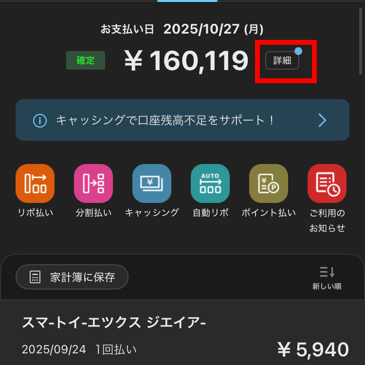- 確認したい月の「お支払い予定額」の下にある「詳細」ボタンをタップ!