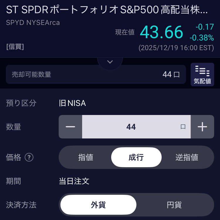 まずは保有しているETFを売却します。このとき、必ず「外貨」決済を選んでください。