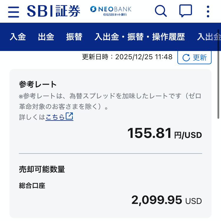 - かかる時間: 手続き後、リアルタイムでSBI証券の日本円残高(買付余力)に反映されます。
