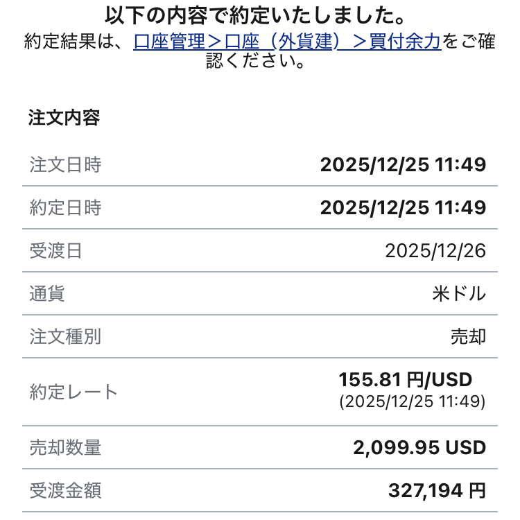 - かかる時間: 売却注文が成立した日から3営業日後(受渡日)に、米ドルとして現金が確定します。