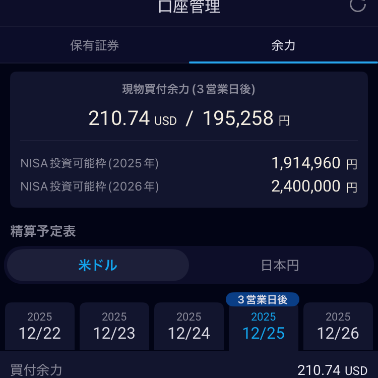 - 「口座」タブ > 「買付余力」 を見ると、現在貯まっている米ドルの総額が分かります。