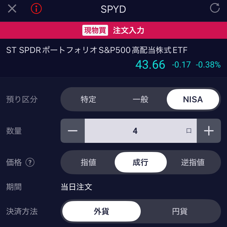 - 手動で買う: 欲しいタイミングで「外貨」決済を選んで注文。
