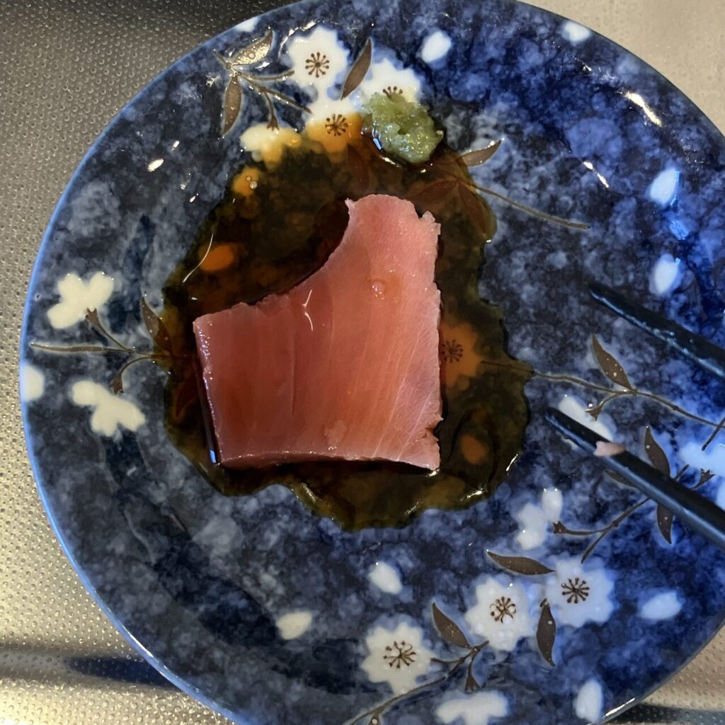 自分に言い訳をして、わさび醤油を用意。 一切れ口に運ぶと、程よい脂ののったみなみマグロが、赤身とは思えないほど美味しいではないですか。