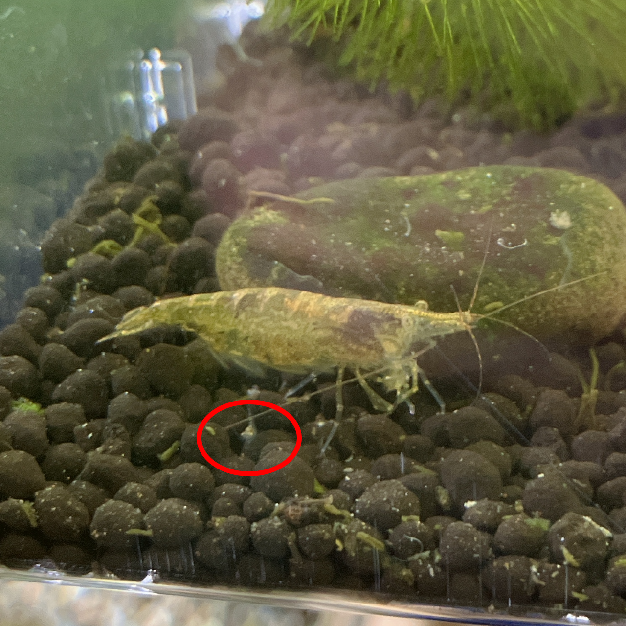 室内飼育している水槽のミナミヌマエビが、何やら卵を抱えていました。