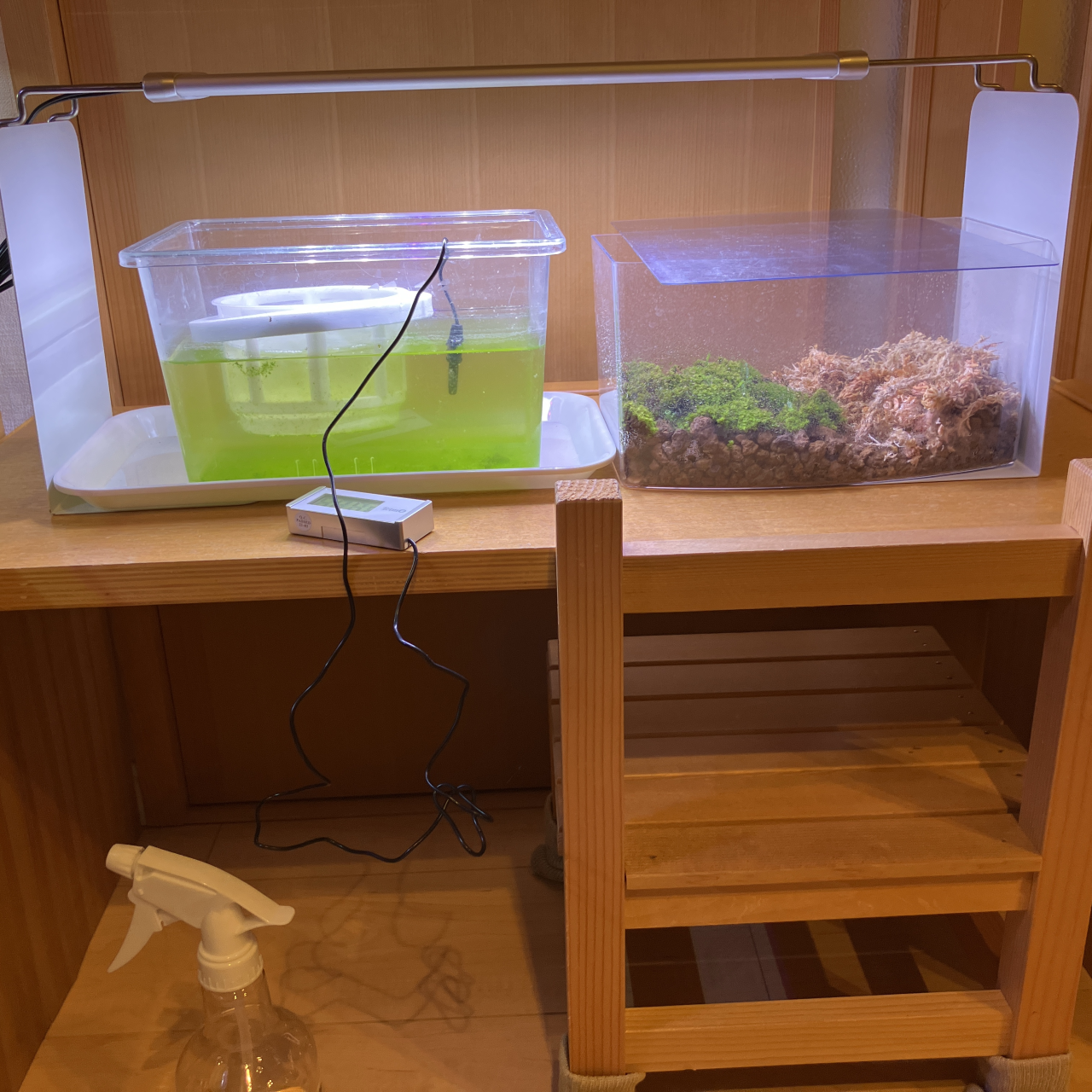 【室内飼育プラケース】水温上昇のため昼間に2日屋外日向においた結果、グリーンウォーター化かした