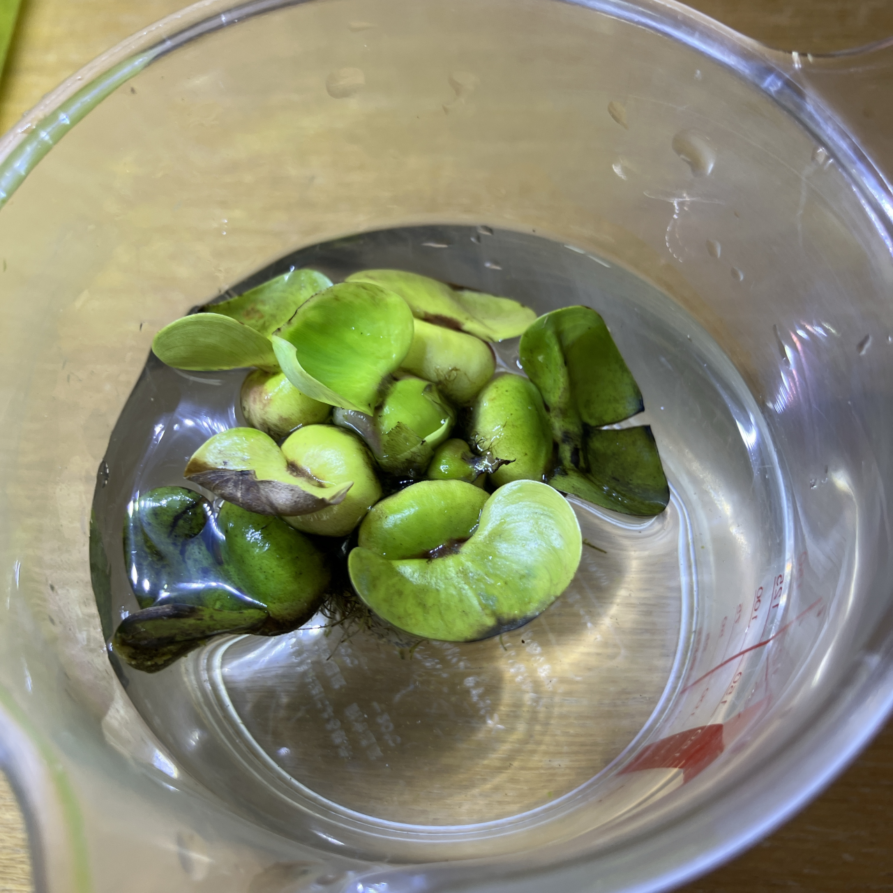メダカの赤ちゃんはあまり泳げないので、小さい容器にホテイアオイを入れてみました。