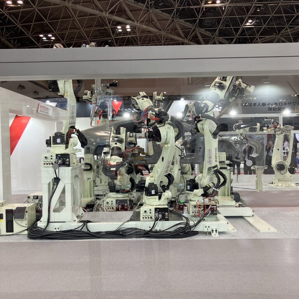 特に川崎重工のブースは、自動車工場をそのまま持ってきたかのような迫力!巨大な産業用ロボットが、まるで軽々と車体や巨大なパーツを扱い、溶接や組み立てといった高精度な作業をこなしているんです。