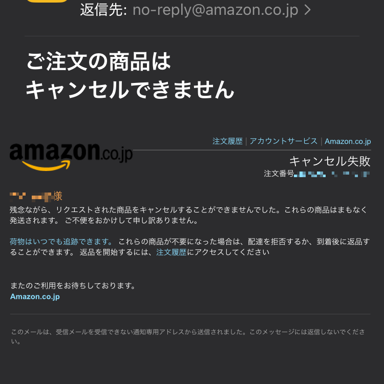 「残念ながら、リクエストされた商品をキャンセルすることができませんでした。(中略)これらの商品が不要になった場合は、配達を拒否するか、到着後に返品することができます。
