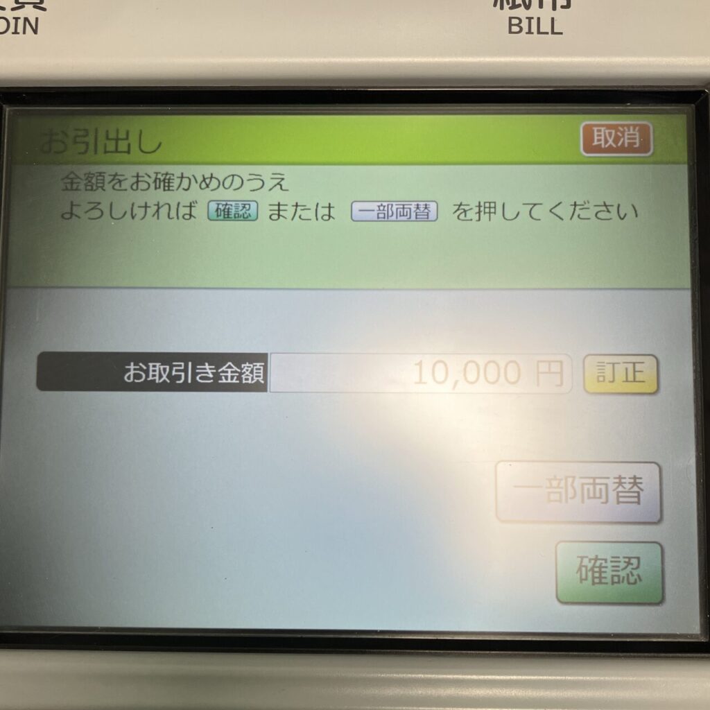 わざわざ「10千円」なんて特殊な入力をしなくても、JAのATMでは「1万円の引き出し時に『一部両替』を押せば、全額が千円札(10枚)になる」という仕様だったのです。